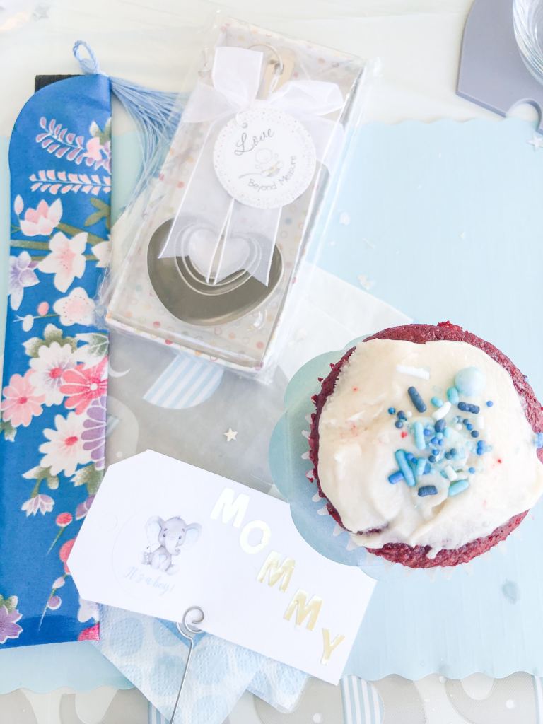Staying on theme, my mom – who is a wonderful baker – also made red velvet cupcakes and topped them with blue sprinkles that were perfectly on theme. The cupcakes were displayed at each table setting on a mini stand and were, as a result, absolutely darling.