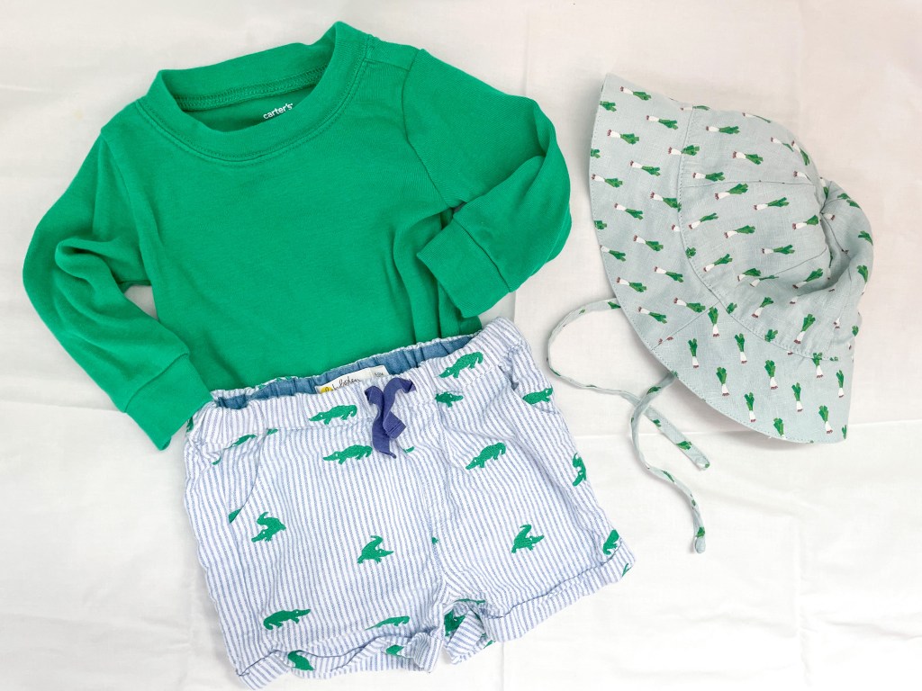 Facebook Marketplace is definitely a great place to start. Facebook is a widely used platform, so chances are, there is going to be a wide selection in the gender and age you’re looking for. That being said, it’s also worth checking out thrifting apps like Poshmark and Depop. I thrifted this cute gnome shirt for Alden on Poshmark and the hat on Depop!